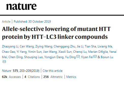The paper “Allele-selective lowering of mutant HTT protein by HTT–LC3 linker compounds” by the research team led by Prof. Boxun Lu is selected as one of Nature’s “10 remarkable papers from 2019”.