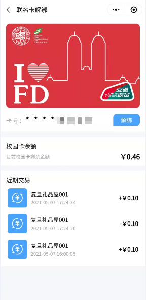 Tap on “复旦联名卡” (Fudan 2-in-1 virtual eCard) in “复旦ecard” (Fudan eCard) WeChat mini-program - Tap on 解绑 (Unbind)