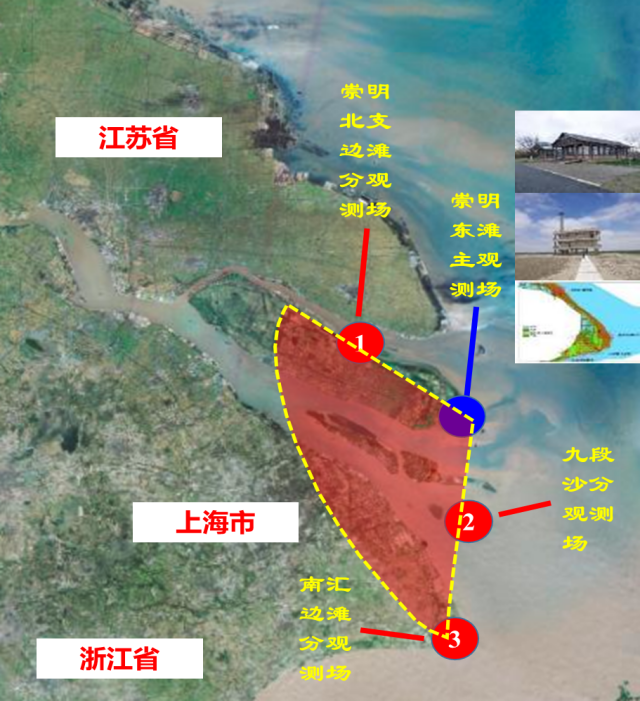 and its three branches in Chongming Island (1), Jiuduansha (2) and Nanhui (3)