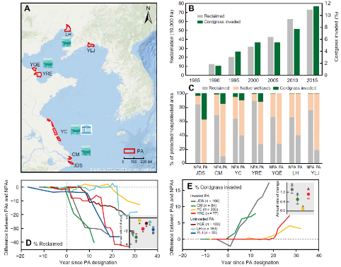 By analyzing three decades of seven of the largest, oldest, and best-managed coastal PAs in China, including multiple World Natural Heritage and/or Wetlands of International Importance sites, this study assesses the impacts of Spartina alterniflora, an exotic species on the performance of PAs at large spatiotemporal scales.