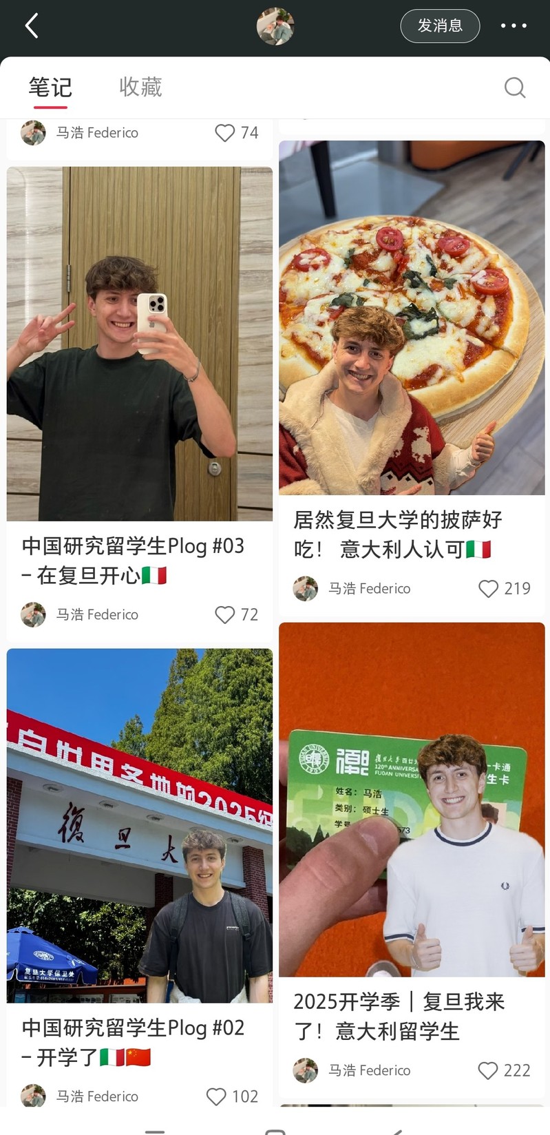 Beyond his academic commitments, Federico has also made a name for himself on RedNote as a content creator, using his Chinese name “马浩”. About two years ago, he launched his account to share his experiences as an international student in China. His posts, which focus on cultural exploration and personal anecdotes, have garnered over 130,000 likes from Chinese netizens.
