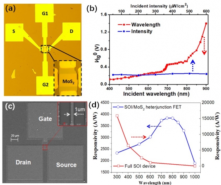 此外,由万景发明新型的界面耦合光电探测器(ICPD)首次将绝缘层上硅中独特的界面耦合效应用于大幅增强光电探测灵敏度。其团队进一步将此机理应用于绝缘层上硅/二维材料的异质器件中,实现了响应频谱调控功能,相关成果发表于《IEEE电子器件快报》(IEEE Electron Device Letters),器件可应用于多波段光电探测成像。