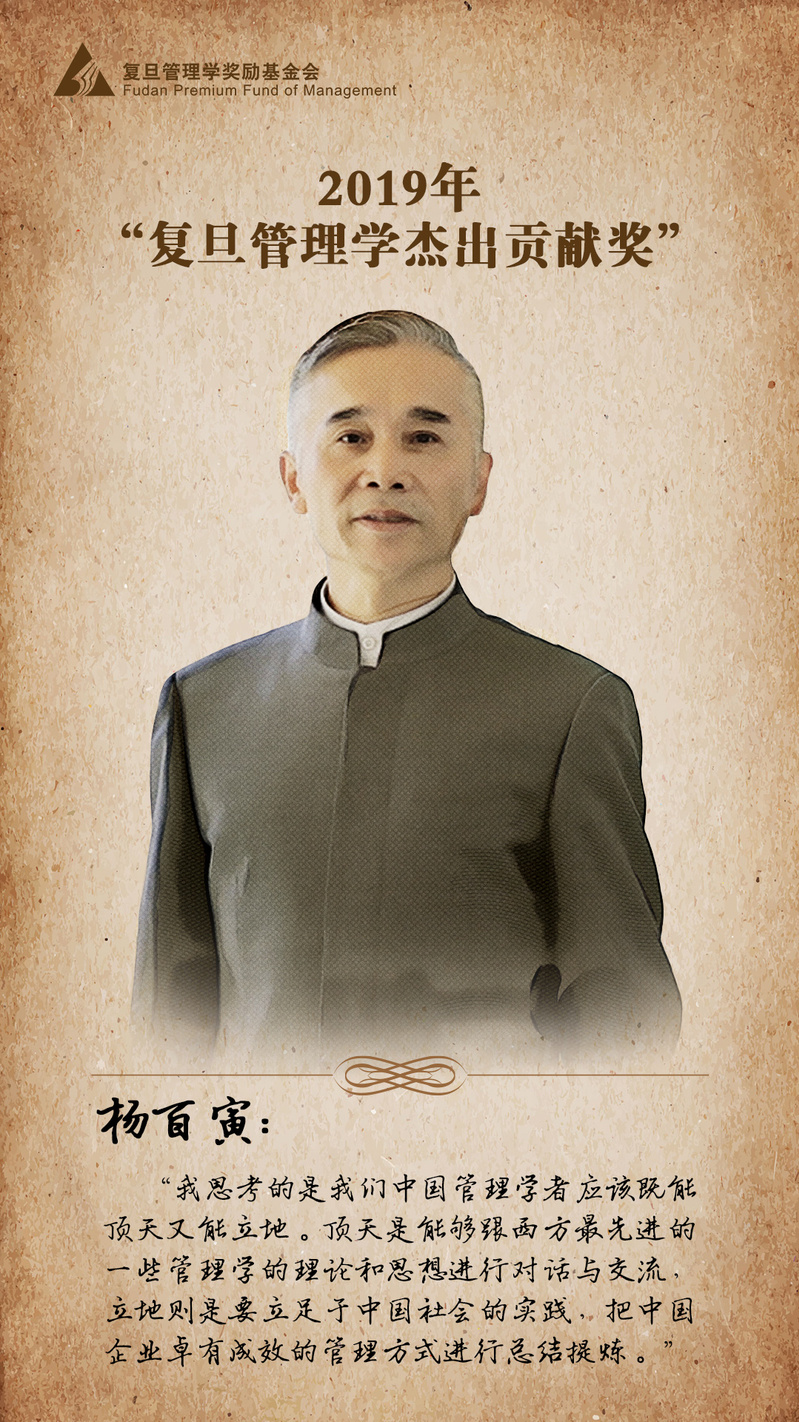 复旦管理学杰出贡献奖获奖人杨百寅教授主要从事中国式管理与领导力开发、知识整体论及应用、学习型组织等管理领域的研究。他提出了中国社会组织和领导行为受到三种意识形态和思想文化共同影响的理论观点,为系统分析全球化背景下中国管理实践、提炼符合中国国情的管理学思想与理论提供了有意义的分析框架。他通过应用扎根理论识别中国背景下组织文化的基本维度,验证了关于组织冲突的理论模型。他还提出了中国文化背景下集体领导力的概念并开展了深入的探析。杨百寅就知识整体论等相关概念进行了理论构建,突破了传统认识论的局限,提出了整体哲学视角下的知识“三元”动态平衡模型,并分析了知识整体论在人力资源管理、知识管理、战略管理中的实践应用价值。他还开发了学习型组织的理论模型和科学测量工具(DLOQ),该研究处于国际领先地位,其量表先后被译为7种文字,在国际上被广泛使用;率先验证了学习型组织对企业财务绩效的正面影响;建立了管理者作为教练的理论模型,并开发了相应的测量工具。