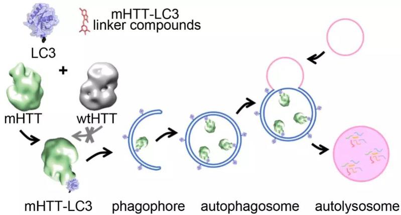 既然运用阻断剂阻断或抑制致病蛋白的传统道路行不通,团队另辟蹊径,着眼于驾驭细胞自噬这一细胞内蛋白降解途径以有效降低变异亨廷顿蛋白水平。在自噬过程中,关键蛋白LC3被脂化后聚合扩增,形成膜结构,并将蛋白、脂类、细胞器等降解目标包裹于其中,形成完整的自噬小体(autophagosome),与溶酶体融合后,其中包裹的物质得以降解。