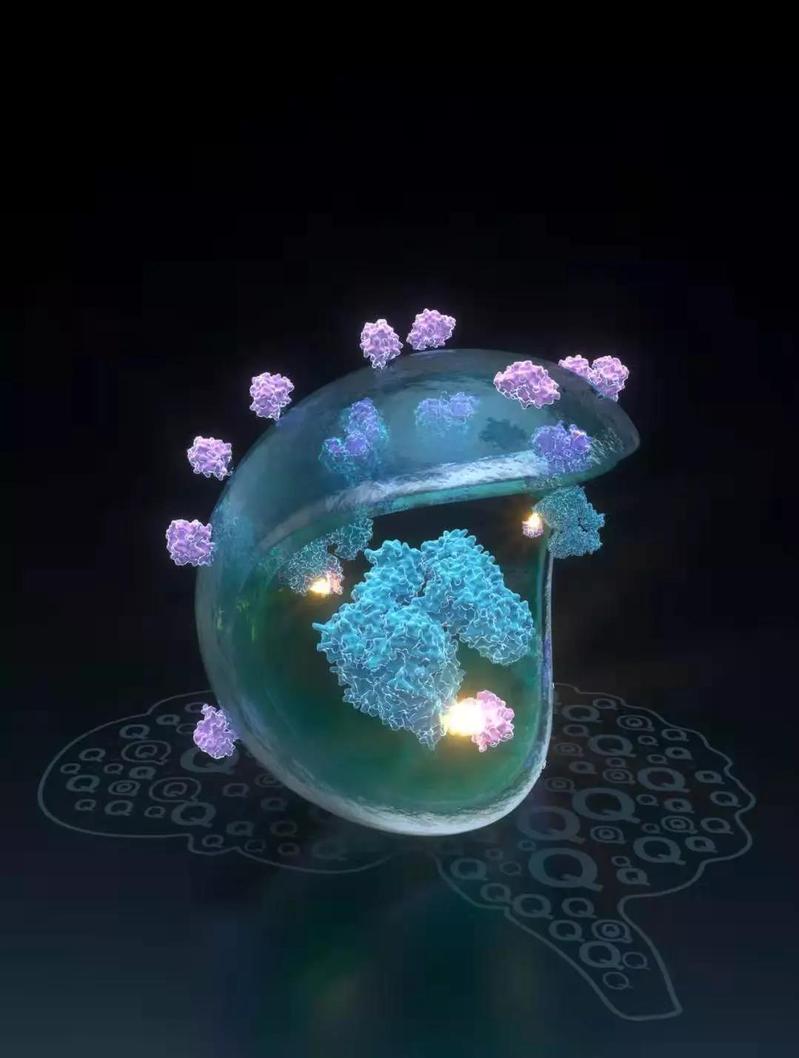 发光的小分子胶水连接了致病蛋白mHTT(蓝色)和自噬小体蛋白(紫色),将其带入自噬小体进一步降解