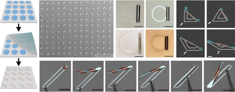 利用这一方法制备卷曲三维微纳结构的过程十分简单。仅需将一滴液体滴加在图形化沉积的多层纳米薄膜样品上,纳米薄膜便会在接触到液体的瞬间从基底剥离卷曲形成各种三维结构。而液体在样品表面的流动扩散会不断剥离每一个接触到的纳米薄膜,完成规模化的制备过程。通过不同的基底材料设计,这一方法成功应用于各种金属及氧化物体系的三维微纳结构的制备。为了实现对纳米薄膜卷曲行为的精确控制,研究团队利用与微操作系统相连接的毛细管控制样品表面的微液滴运动以精确设定液体与纳米薄膜的接触剥离点,使纳米薄膜摆脱了图形和材料的限制,能够沿着任意方向进行卷曲。结合纳米薄膜的图案设计,完成了各种复杂三维结构的设计和制备。研究团队充分利用了这一新颖的制备方式构筑不同材料的三维微纳结构,展示了其在气体传感、光学谐振腔、微纳马达及机器领域的应用潜力。