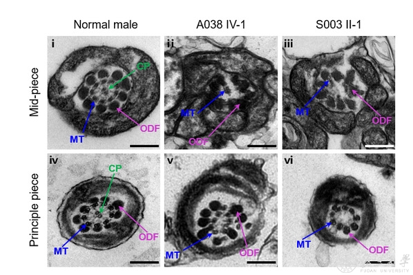 图2:正常精子(i, iv)和TTC29基因缺陷患者的精子超微结构(ii, iii, v, vi)