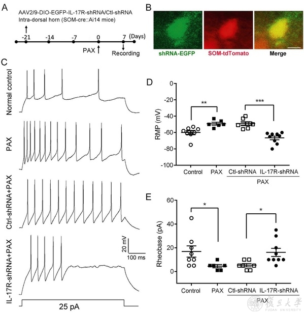 近年来,关于中枢神经系统IL-17在疼痛特别是病理性疼痛中的作用和调控机制研究较少,缺乏对其来源和调节机制的探索。张玉秋教授课题组首次发现,外源性给予IL-17显著增强脊髓背角浅层Somatostatin(SOM)阳性神经元的兴奋性突触后电流,同时可以抑制SOM阳性神经元的抑制性突触后电流;在紫杉醇诱导的神经病理性痛小鼠,脊髓背角星形胶质细胞合成和释放IL-17增加,SOM阳性神经元过度兴奋,出现与外源性IL-17处理类似的效应;特异性敲除脊髓背角SOM阳性神经元表达的IL-17受体(IL-17R)可翻转紫杉醇引起的SOM阳性神经元兴奋性增强,并有效地缓解化疗性神经病理痛,而在脊髓背角星形胶质细胞中过表达IL-17可以直接诱导机械性痛觉敏化。进一步研究发现,背根神经节初级感觉神经元上也表达IL-17R,由外周胶质细胞分泌的IL-17通过IL-17R增强初级感觉神经元的兴奋性也参与化疗痛的外周敏化。