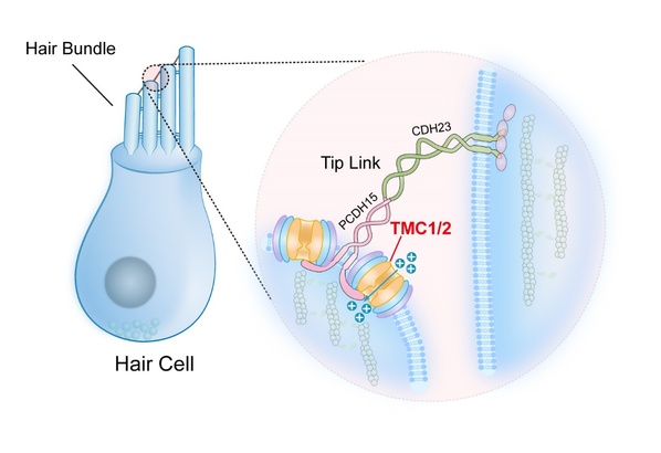 科学家探索已久的耳蜗毛细胞中的听觉转导离子通道究竟是何方神圣?团队用研究结果给出了答案——TMC1/2。