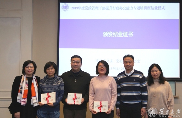 2019年11月29日下午,复旦大学2019年度党政管理干部提升行政办公能力专题培训班在光华楼东主楼101报告厅举行结业仪式。来自各院系、所、中心和机关部处的59位综合办主任及部分部门公文管理员顺利完成了包括主题报告、团体训练、实务操作、交流讨论等24学分的课程培训。