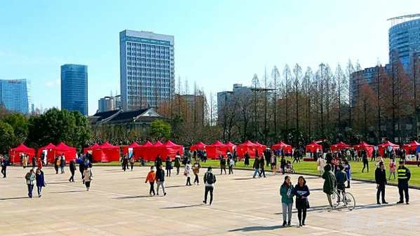 光华楼前的草坪,整齐的摊位仿佛一片红色的海洋,在略显萧瑟的冬日,点燃着梦想的火种,这里是同学们打卡、投递明信片的地方。