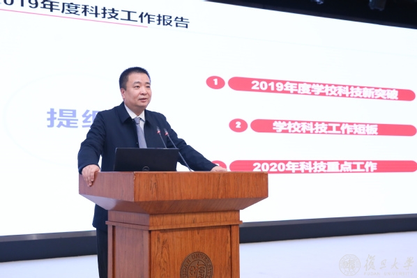 许宁生在讲话中指出,2019年学校科技工作取得了历史性突破,实现了量和质的飞跃。他对学校相关部门和广大科技工作者的共同努力表示感谢并强调,当今世界面临“百年未有之大变局”,新一轮科技革命和产业革命正在加速世界格局的重塑,科技创新驱动发展战略成为提高国家核心竞争力的必然选择,创新加速、深度融合、应用导向三大趋势日益彰显。面对新时代新要求,在清晰认识当前科技创新发展新态势的基础上,复旦大学要主动承接国家使命担当,复旦大学的科技创新方向要同国家发展的现实目标和未来方向紧密联系在一起,不仅关注扩大学校的学术国际影响,更要为国家经济社会发展做出实质性贡献,在上海建设国家科技创新中心的重任中发挥更大作用。