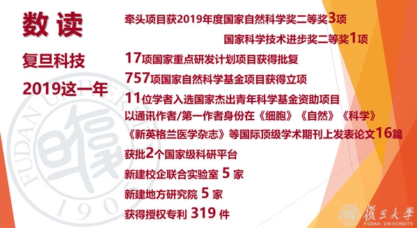 牵头项目获得2019年度国家自然科学奖二等奖3项、国家科学技术进步奖二等奖1项;17项国家重点研发计划项目获得批复,757项国家自然科学基金项目获得立项,11位学者入选国家杰出青年科学基金资助项目;复旦学者以通讯作者/第一作者身份在《细胞》《自然》《科学》《新英格兰医学杂志》等国际顶级学术期刊上发表论文16篇;获批2个国家级科研平台;新建校企联合实验室5家,新建地方研究院5家;获得授权专利319件……这些数字记录着2019年复旦大学的科技创新征程。
