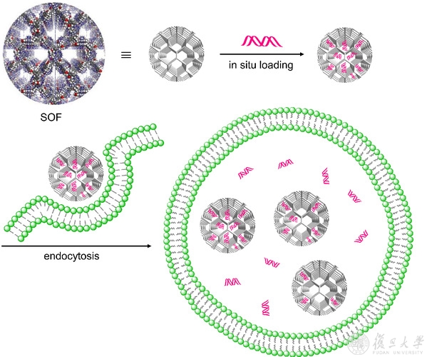 研究组发明的水溶性超分子有机框架纳米孔材料,可以原位负载和输送核酸