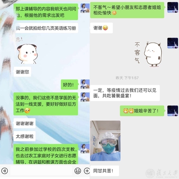 “感谢复旦大学医学院的安澜同学,很细心、很用心地担任我家孩子的家教老师,有爱有信仰的一群人,将来一定是一名出色的医生!”一名一线医护工作者的妻子说。
