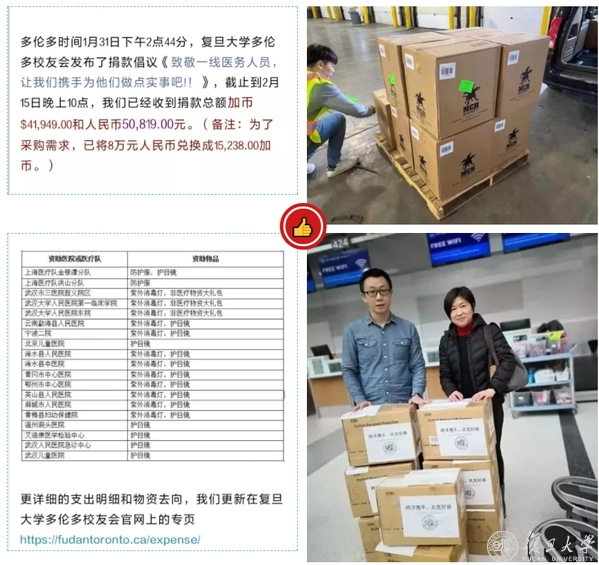 自多伦多时间1月31日,多伦多校友会发布了《致敬一线医务人员,让我们携手为他们做点实事吧!!》的捐款倡议,截止到2月15日晚上10点,已经收到捐款总额加币$41,949.00和人民币50,819.00元。目前,已购买防护服、护目镜、紫外线杀菌消毒灯等医疗物资,分批运回国内,捐赠给上海医疗队武汉金银潭分队、上海医疗队洪山分队、武汉大学人民医院东院及武汉市各医院、以及北京、宁波、云南、黄冈等各地区急需支援的医院。