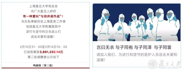 为支援战“疫”在一线的上海市医务工作者,2月10日,上海校友会向广大复旦人发出倡议,向无私奉献的全上海医务工作者,包括复旦大学各附属医院,逆行与坚守的白衣战士们送去关爱和温暖!