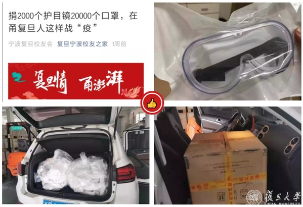 面对汹涌的疫情,美国(纽约)校友会一直以来都心系着祖国、牵挂着一线战“疫”的医务工作者。为早日打赢这场“疫情”,2月10日,向身居海外关心祖国抗疫的校友们发起“抗击新型冠状肺炎专项捐赠基金”募捐倡议。此外,纽约校友会还联合各地33名校友和复旦教师众筹了1000个护目镜。2月15日,捐赠采购的第一批物资——600个医用护目镜,已送达复旦援鄂医疗队。战“疫”当前,无数复旦人默默为复旦逆行者奉献着光和热,为抗疫尽一份复旦人的力量。