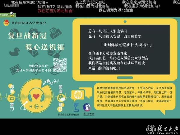 为响应国家号召,鼓舞居家师生坚定战“疫”决心,2月19日、21日、23日晚,复旦大学团委学生艺术团办公室与学生会联合主办了“青春云接力,加油战新冠”2020复旦大学战“疫”线上直播系列活动。