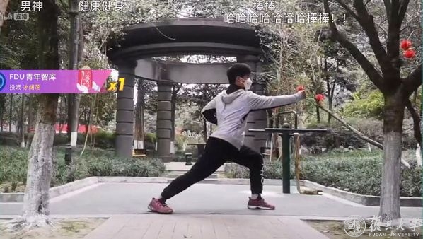 复旦大学国际舞协的成员们分别在各自家中起舞,和着《平凡天使》的背景音乐,以优美的舞蹈动作和手语,表达了对医护人员以及千千万万坚守岗位者的感激。校武术队队员进行了强身拳的表演以及武术基本动作示范,鼓励大家在家积极进行锻炼,强身健体。