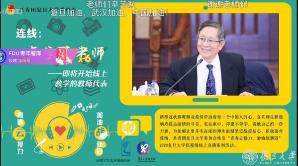 在直播中,主持人连线了几组特邀嘉宾,他们有的是奋战在第一线的复旦医务工作者,有的是坚守校园岗位的教职工,有的是湖北学生代表,还有的是即将开始线上教学的人气教师……尽管身在八方,大家都在为抗击疫情默默奉献,为迎接美好春天的到来贡献力量。
