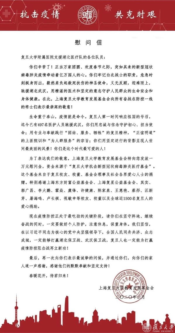 复旦大学和复旦大学上海医学院也全力保障前线急需物资供应。1月29日,为更好地支持学校和附属医院一线医务工作者和学校疫情防控相关工作,上海复旦大学教育发展基金会携手复旦大学校友会设立专项基金,广大师生员工和复旦校友、校董纷纷捐资捐物,暖心暖情。近日,上海复旦大学教育发展基金会为前线作战的复旦白衣战士发放了10000元的慰问与奖励。
