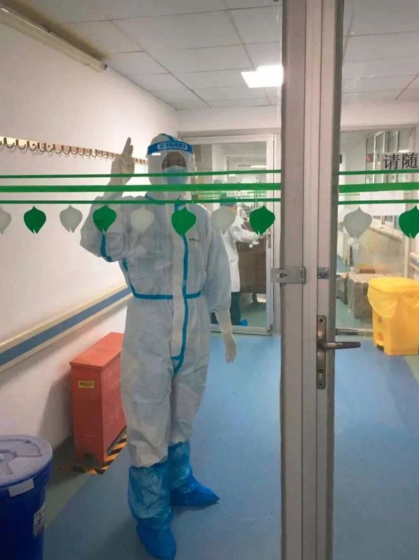 钟鸣:车开进医院,当时下着雨,我觉得这个医院里像是完全没有人,跟之前想象的气氛还是蛮符合的。然后邱院长带着我们几位,直接到了南7楼的ICU,在门口穿了很多衣服就进去了。从那个时候就感觉,要穿得这么严实,传染性可能是未知的,仿佛一来就直接进入最高级别的战斗状态。