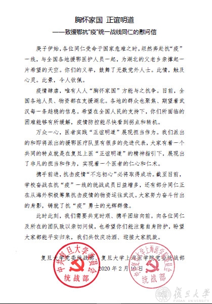 疫情防控工作已经到了最关键的时期,复旦大学统一战线将在学校党委的坚强领导下,众志成城、共克时艰,在这场没有硝烟的战斗中主动担负起社会责任,为打赢疫情防控阻击战作出新的更大的贡献,展现学校统一战线的风采。