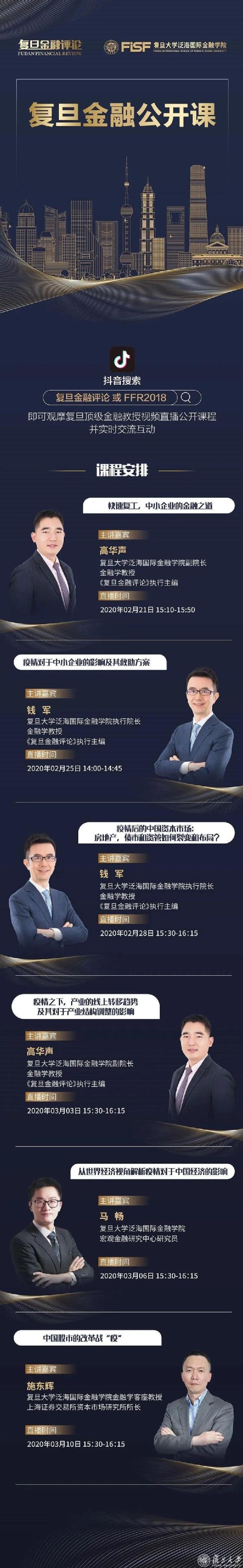复旦金融公开课首期共有六期课程,除了对资本市场的关注,钱军教授在此之前还深度解读了疫情对中小企业的影响并提出“三管齐下”的短期和中长期救助方案,助力中小企业化“危”为“机”。与此同时,复旦大学泛海国际金融学院副院长、《复旦金融评论》执行主编、金融学教授高华声也立足金融,分析疫情之下中小企业的快速复工之道,和产业的线上转移趋势及其对产业结构调整的影响。接下来,复旦大学泛海国际金融学院金融学客座教授、上海证券交易所资本市场研究所所长施东辉,复旦大学泛海国际金融学院宏观金融研究中心研究员马畅也将分别带来主题为“中国股市的改革战‘疫’”和“从世界经济视角解析疫情对于中国经济的影响”的复旦金融公开课。