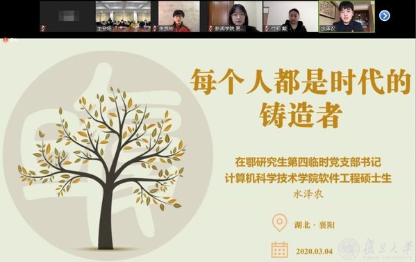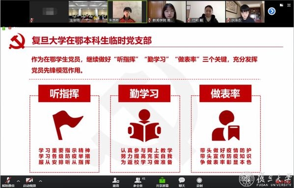 3月4日下午,一场跨越沪鄂两地、意义不同寻常的网络视频会议举行。复旦大学7个在鄂学生临时党支部在抗疫最前线成立。
