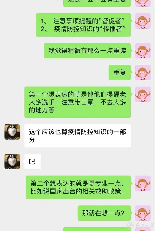虽然宅在家里,但是同学们还是能够通过网络等形式开展调研、科普、辅导等丰富多彩的实践活动,用网络将青年力量汇聚起来。同学们能够在实践过程中深刻认识到当前的严峻防疫形势,勇于担当,主动作为,承担青年责任,发挥青年作用,弘扬社会正气,尤其是注重要能够有机结合自己的专业特长,如新闻学院已经有不少同学通过制作抗疫vlog、防谣数据报道等形式取得了良好的传播效果。期待同学们能够继续一心“移疫”、“抑疫”生辉,产出形式更加多样、内涵更加丰富的实践成果,为打赢疫情防控攻坚战贡献青春力量。
