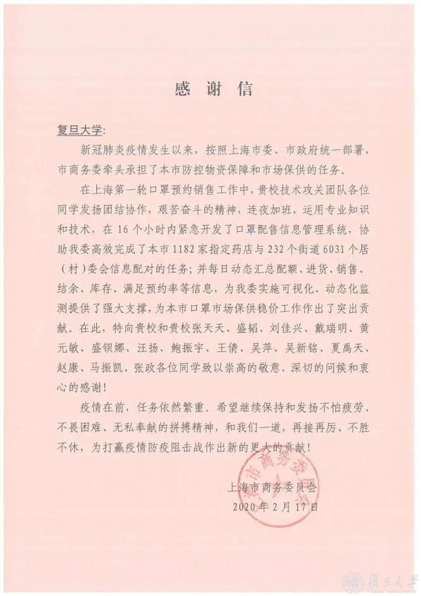 公共卫生学院与计算机科学技术学院的学生团队连续奋战16个小时,为上海市紧急开发了口罩预约配售系统,连接6077个居委、1182家药店、58个配送公司,辐射上海2480万居民。
