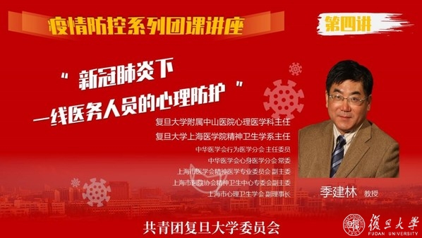 一线医务青年的需要亦为复旦大学团委所关注,第四讲为《新冠病毒下一线医务人员的心理防护》由复旦大学附属中山医院心理医学科主任季建林教授授课,从医护人员所处的“战疫”环境出发,为“白衣天使”疏通心理问题提供了科学方法。