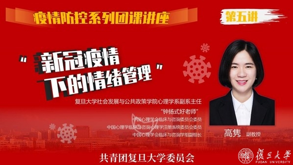 面对疫情,你的情绪还好吗?如何调节情绪,接纳自己,理性看待此次新冠病毒带来的挑战?3月3日,复旦大学社会发展与公共政策学院心理学系高隽老师在哔哩哔哩直播间为同学们带来了团课第五讲《新冠疫情下的情绪管理》。她从专业的心理学领域出发,围绕“觉察”“理解”“行动”三个关键词展开,解析了人们的心理活动,帮助同学们缓解面对疫情时的焦虑与压力。老师娓娓道来,同学们踊跃参与,直播人气值挤进了小时榜前十。