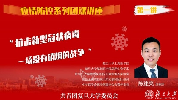 24小时内10411人加入讲座,8897人完成视频学习,7935人填写课后问卷……2月11日,复旦大学疫情防控系列团课第一讲《抗击新型冠状病毒——一场没有硝烟的战争》上线。基础医学院病原生物学系副教授陈捷亮从去年底发生的不明肺炎切入,讲述了新型冠状病毒的分离鉴定以及对其病原学、流行病学和临床特点逐步认知的过程,梳理了疫情开始至今关键的演变阶段和防控难点,讲解了切实执行传染病防控三原则的必要性,展现了众志成城、同舟共济的中国精神和复旦上医人的使命担当。