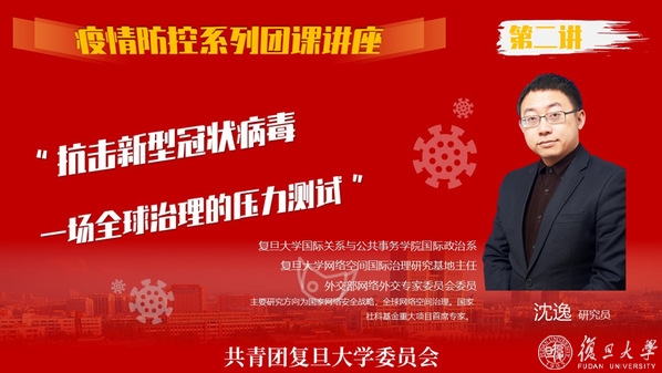 2月18日,团课第二讲如约而至。复旦大学国际关系与公共事务学院研究员、网络空间国际治理研究基地主任沈逸主讲的《抗击新型冠状病毒——一场全球治理的压力测试》在哔哩哔哩网站直播,吸引了超过10万的人气。他从抗击新冠病毒的国内外背景谈起,回顾了几次重大的国际关注的突发公共卫生事件,提出了“单一国家难以有效应对大规模流行疾病的挑战,人类健康状况的持续改善离不开有效的国际协调”,引导同学们从人类命运共同体的角度来看待此次疫情,学会建设性的评论和积极的建议,共同对抗谣言的流传,以正确的心态去认识疫情,以积极的态度去抗击疫情。