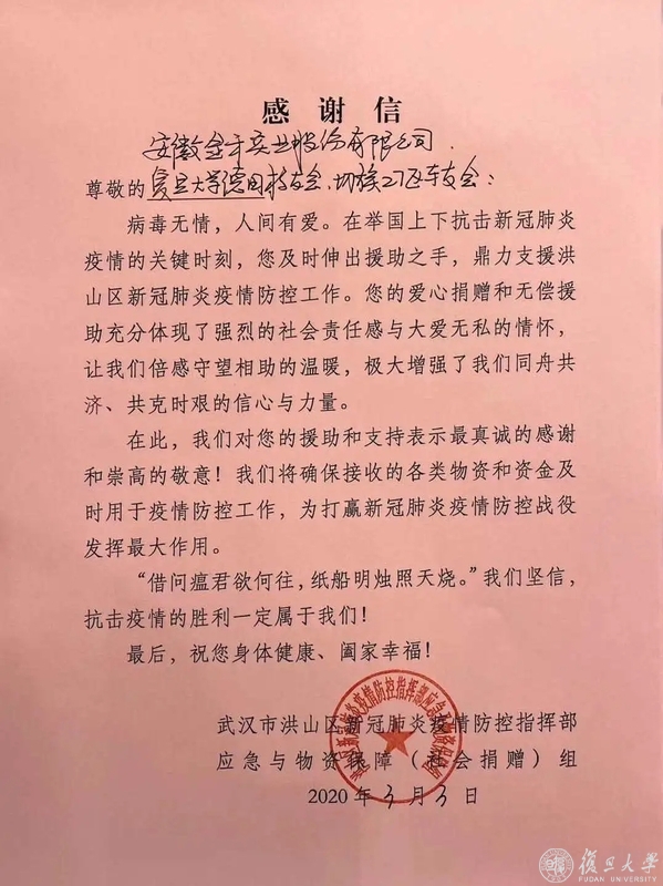 战“疫”当前,无数校友牵挂着复旦医务工作者。他们克服众筹、采购、运输等各种困难,迎难而上,为驰援武汉、坚守上海的复旦医务工作者送去一批批宝贵的防疫物资,助力白衣勇士战胜疫情。