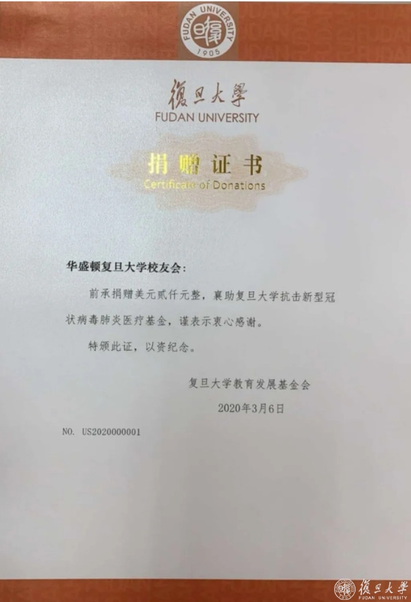 3月4日,华盛顿校友会向复旦大学抗击新型冠状病毒肺炎医疗基金捐赠2千美元,全力支援母校开展新型冠状病毒感染肺炎医疗救治和防控工作,打赢疫情防控战。该笔捐款是复旦华盛顿校友基金会自1月28日发起的募捐行动的项目实施内容之一。