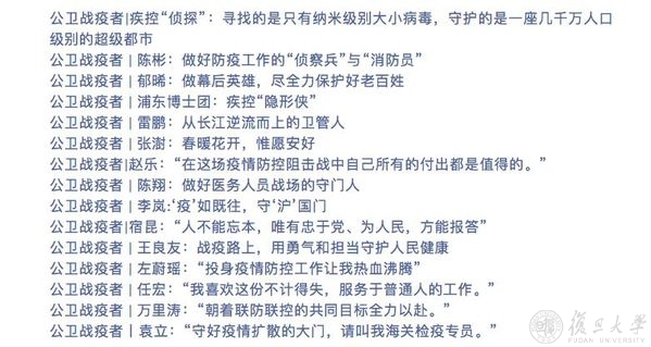 新冠肺炎疫情爆发以来,无数白衣战士奋斗在医疗救治和疫情防控的战线上,其中有不少是公共卫生学院的校友。有上海疾控中心首批驰援武汉的疾控人,有担当在各地检疫战线上的守门人,也有奋战在防疫指导和防疫监督工作岗位上的......他们用自己的实际行动践行了“团结、服务、牺牲”的复旦精神,“正谊明道”的上医精神和“为人群服务”的宗旨,展现了卫生与健康工作者“敬佑生命、救死扶伤、甘于奉献、大爱无疆”的高尚品格。公共卫生学院与新闻学院联合推出「公卫战“疫”者」系列人物访谈活动,记录校友们的真实战“疫”故事。目前已采访了22位校友,形成稿件近三万字,用文字同战“疫”校友一道并肩作战。