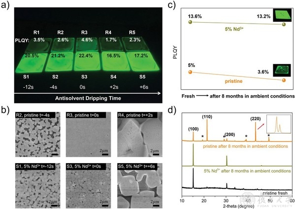 张树宇课题组通过Nd3+稀土离子掺杂,不仅实现了超宽的反溶剂工艺时间窗口,同时掺杂后的MAPbBr3钙钛矿薄膜,其光效和稳定性大幅改善,在空气中放置8个月后性能和结构仍保持稳定。这一研究成果为各类钙钛矿薄膜器件的规模化生产提供了有效策略。