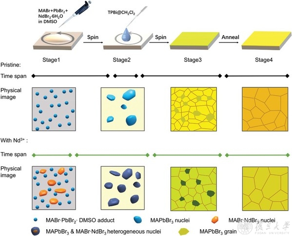 近年来,钙钛矿光电子器件发展迅猛,展现出优异的性能,受到学界和业界的广泛关注。然而,钙钛矿薄膜制备中最常用的反溶剂辅助溶液法对反溶剂滴加工艺要求严苛,反溶剂滴加需要精确把控在3-5秒的工艺窗口内,限制了其在商业化生产中的进一步应用和发展。课题组创新地提出了采用Nd3+稀土离子掺杂引入异质形核过程的方案,实现了18秒的超宽反溶剂工艺窗口,解决了原有工艺存在的痛点。