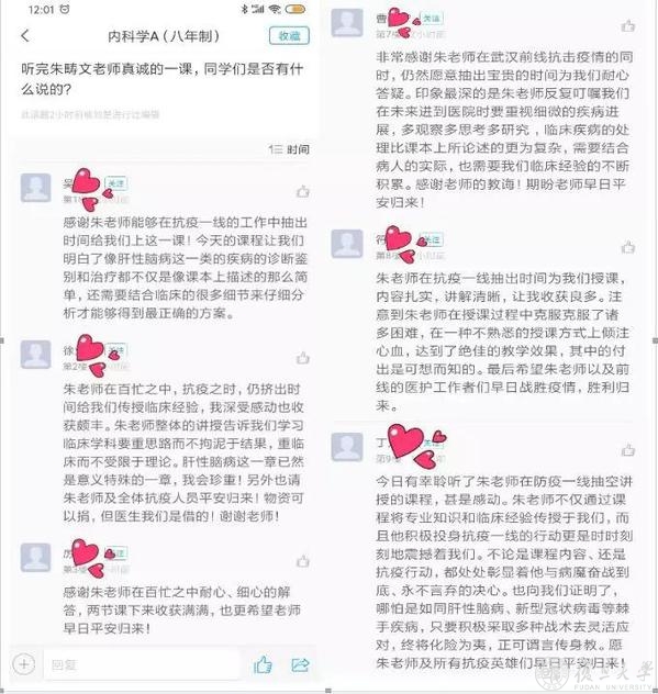 课后,学生们的留言刷屏了课程页面,有珍重:“肝性脑病这一章已然是意义特殊的一章”;有感谢:“感谢朱老师在抗疫一线的工作中抽出时间上这一课,收获满满”;有敬意:“朱老师以身作则告诉我们未来如何做一名好医生好老师”;有祝福:“朱老师和全体抗疫人员平安归来!”