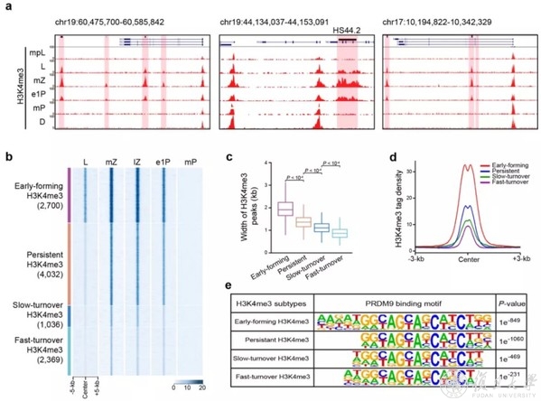 PRDM9介导的H3K4me3修饰的特性a. PRDM9介导的H3K4me3代表性UCSC track,浅红色背景指示PRDM9介导的H3K4me3信号;b. 热图展示了H3K4me3信号强度,依据H3K4me3修饰的周转时间将其分为四种类型;c-d. mZ阶段H3K4me3修饰信号的平均宽度与强度在上述四种类型中的比较;e. PRDM9结合基序在上述四种类型中的富集情况。