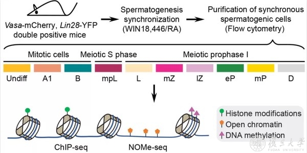 作为减数分裂系列研究的一部分,为了阐明表观遗传是否以及如何调控减数分裂同源重组,此次研究在纯化各级生精细胞的基础上,将减数分裂前期I细胞细分为7个时期进行研究(图1),结合ChIP-seq技术,分析了包括H3K4me3在内的8种组蛋白修饰在减数分裂前后的动态变化;应用NOMe-seq,观察了DNA甲基化以及染色质开放状态的动态变化(图1),揭示了之前难以发现的减数分裂前期I细胞演化的未知规律。