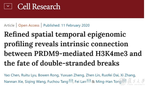 近日,复旦大学生物医学研究院研究员、复旦大学附属中山医院兼职教授蓝斐课题组与中科院分子细胞卓越创新中心(上海生物化学与细胞生物学研究所)研究员童明汉课题组、北京大学研究员汤富酬课题组合作在《细胞研究》(Cell Research)上发表论文“Refined spatial temporal epigenomic profiling reveals intrinsic connection between PRDM9-mediated H3K4me3 and the fate of double-stranded breaks”。与之前PRDM9决定DSB热点研究不同,该文提出PRDM9及其介导的H3K4me3协同局部染色质环境可能参与了DSB修复过程,与同源重组命运决定相关;发现早期生成的DSBs更倾向于修复形成交叉。本文不仅为同源重组命运决定和交叉稳态的调控研究提供了新视角,也证实了遗传物质交换机制和表观遗传调控的相关性。