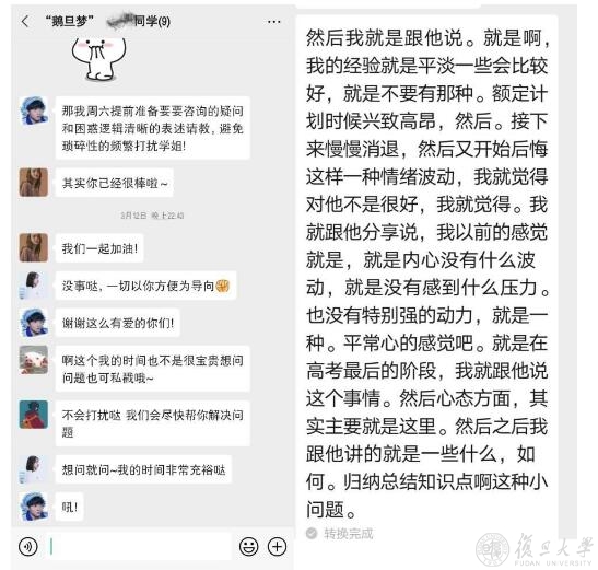 各团支部根据服务家庭学生的性格、学习情况、兴趣爱好等特点,积极开展支部内部分工,探索更多针对性、个性化教学服务形式。“疫情期间都在社区忙疫情防控工作,孩子刚上高中,处于青春期,很开心能够让复旦有经验和共同语言的学生来跟孩子沟通!”黄冈市浠水县的家长蒋女士对于这次活动给予了很高的评价,希望志愿者们与孩子们能畅所欲言,不仅是学习上,更在心理上,生活上给予陪伴与关怀。