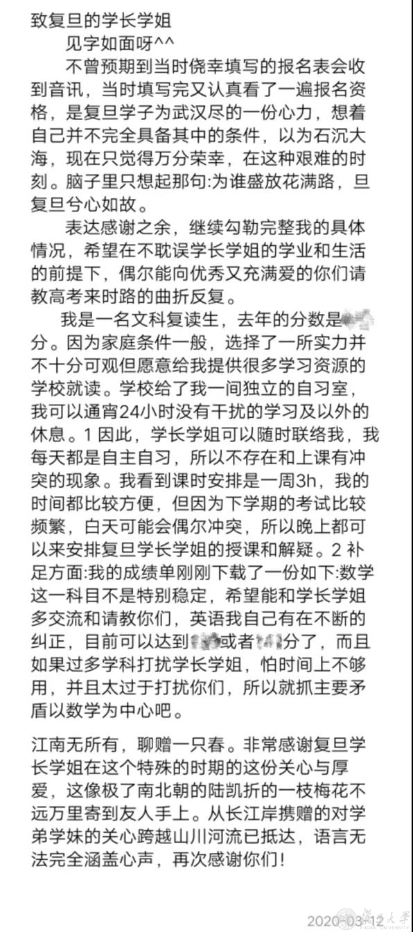 在联系家庭的过程中,一位家长在报名时介绍道,“本人在邮政寄递每天都需加入一线收寄防疫物资,参加社区的值守工作,孩子父亲也是党员,年后一直在最远的县,驻点参加值守和扶贫工作,孩子对复旦特别向往,请多指导,多给他动力!”疫情期间,类似的家长值守在一线的家庭有许多,他们的孩子缺乏陪伴与关爱,“鹅旦梦”计划采取成长结对的辅导模式,鼓励志愿者为学生线上开展心理健康疏导与疫情防护教育等,通过关爱陪伴、写信等形式,在学习之外陪伴孩子的成长。