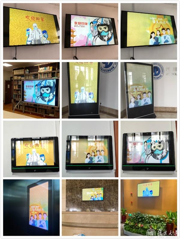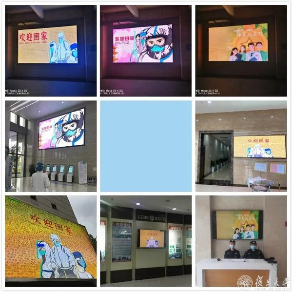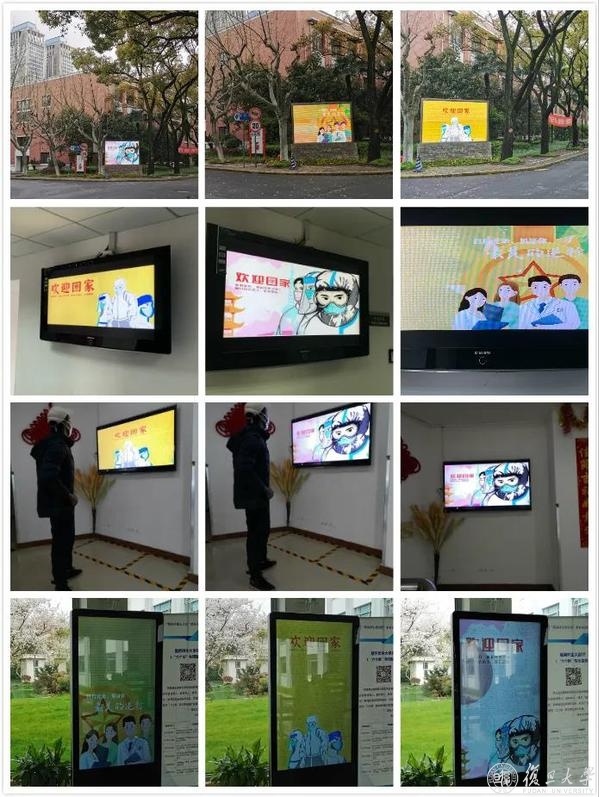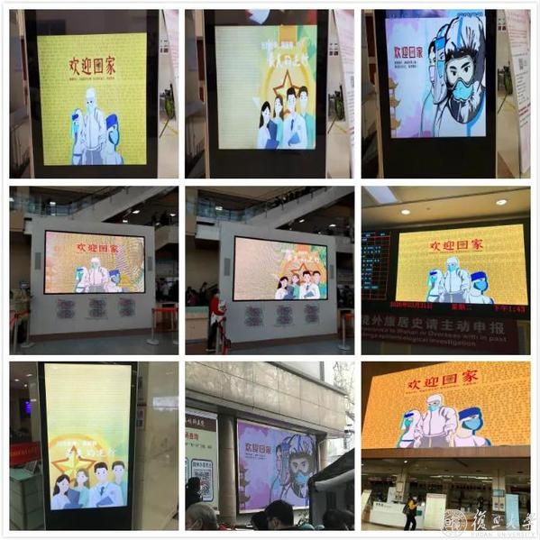 邯郸、枫林、江湾、张江,从校园到各大附属医院,近40家单位的大屏横跨上海东南西北,齐刷刷都是迎接英雄凯旋的画面。