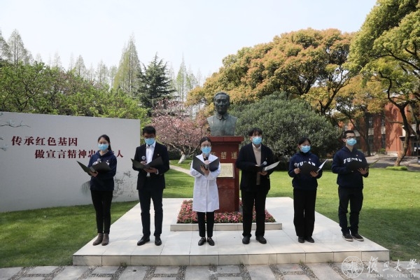 2020年是复旦大学老校长陈望道翻译出版《共产党宣言》首个中文全译本100周年。4月3日上午的复旦校园春意盎然,邯郸校区陈望道塑像旁,新叶吐绿,鸟语花香。复旦师生通过线上线下相结合的方式,举行“传承红色基因,做宣言精神传人”追思纪念活动,缅怀老校长陈望道等复旦先贤先烈,重温“宣言精神”,纪念老校长翻译《共产党宣言》首个中文全译本100周年,启动“红色基因铸魂育人工程”。