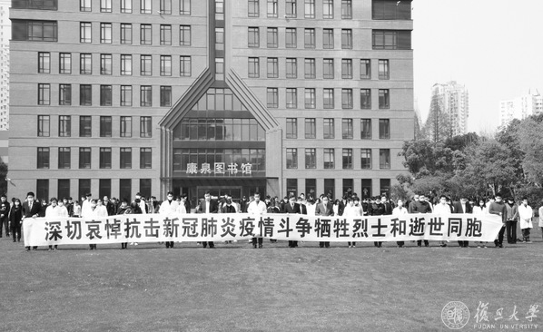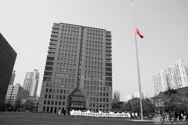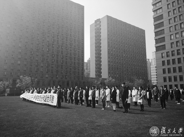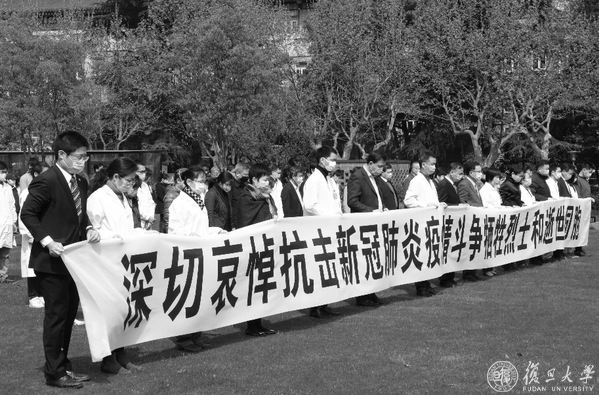 4月4日上午,复旦大学上海医学院西苑同生广场上气氛肃穆凝重,国旗低垂。10时整,校园上空防空警报鸣响,复旦上医师生员工、医务工作者代表200余人在“深切哀悼抗击新冠肺炎疫情斗争牺牲烈士和逝世同胞”的黑白横幅前垂手肃立,庄严默哀三分钟。